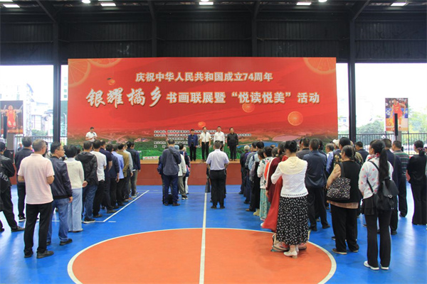 四川新闻网消息 欢乐迎佳节,书画献国庆。为热烈庆祝中华人民共和国成立74周年,9月27日,井研县政协联合县委宣传部主办银耀橘乡书画联展暨“悦读悦美”读书惠民活动。乐山市老年书画研究会会长方为加,县委常委、宣传部部长谢军,乐山市永和诗书画院常务副院长、乐山市老年书画研究会副会长毛福同,乐山市老年书画研究会常务副会长、乐山市永和诗书画院副院长李天贵等出席活动,县政协副主席刘国强主持开幕活动。