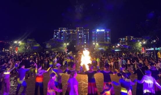 文艺表演结束,现场点燃篝火,演员和观众一起跳起了欢快的达体舞。“很好看,也很好玩,感受到了浓厚的节日氛围。”一位成都游客跳完达体舞高兴地说道。