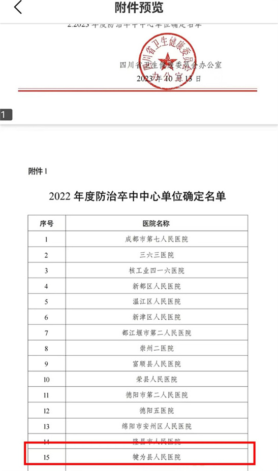 四川新闻网消息 日前,四川省卫生健康委员会发布通知,公布了2022年度四川省防治卒中中心单位名单,犍为县人民医院顺利通过评审验收,成为四川省防治卒中中心单位。