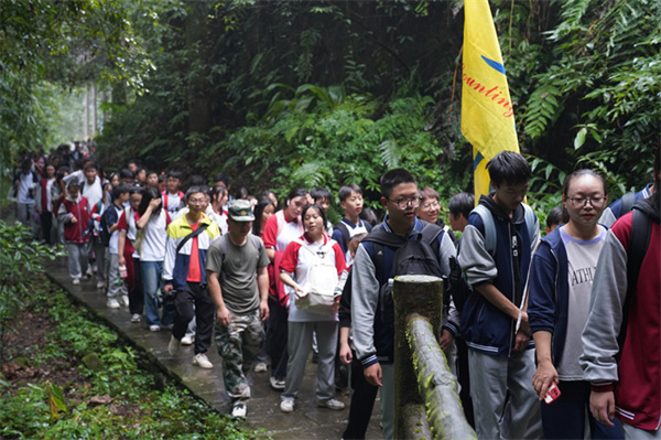 当天上午,该校校长吴勇亲自带队从报国寺出发沿石阶步行约10.4公里到达终点万年寺。一路上,有的同学拍着美景,有的同学哼着歌儿,有的同学研究生物的多样性,有的同学听着导游讲解……大家完全沉浸在研学的喜悦中。“将课堂搬进大自然,成为行走的课堂,让学生更加了解家乡的人文历史,热爱美丽山川。”吴勇说道。