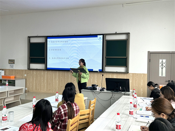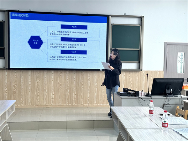 廖芮加老师和邓淋双老师进行了课题案例展示和案例分析。廖芮加老师对前期已开展实践的各层次英语词汇作业样本、批改情况以及各班作业完成情况调查表进行展示,清晰直观地体现了三个层次作业的难度、题型区别和完成率。邓淋双则展示了英语词汇分层作业教师反馈表,该反馈表由课题组成员们在教学实践后填写,由此收集到老师们在词汇分层作业实践中遇到的问题及应对策略。为更好地解决实践中出现的诸多困难和疑惑,便需要进行更深层次的研究,最终归纳并提炼出分层作业模式和评价体系,上升成较为系统的、实操性较强的高中英语分层作业设计。