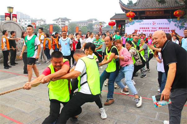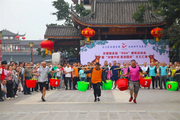 四川新闻网消息 近期,在现场观众们的欢呼声中,乐山市市中区苏稽镇首届“牛BA”趣味运动会在苏稽古镇欢乐开幕,拔河比赛、箩筐挑大米、背篓接沙包、贰柒拾挑战赛等趣味竞技活动吸引了大量外地游客和本地市民前来体验。