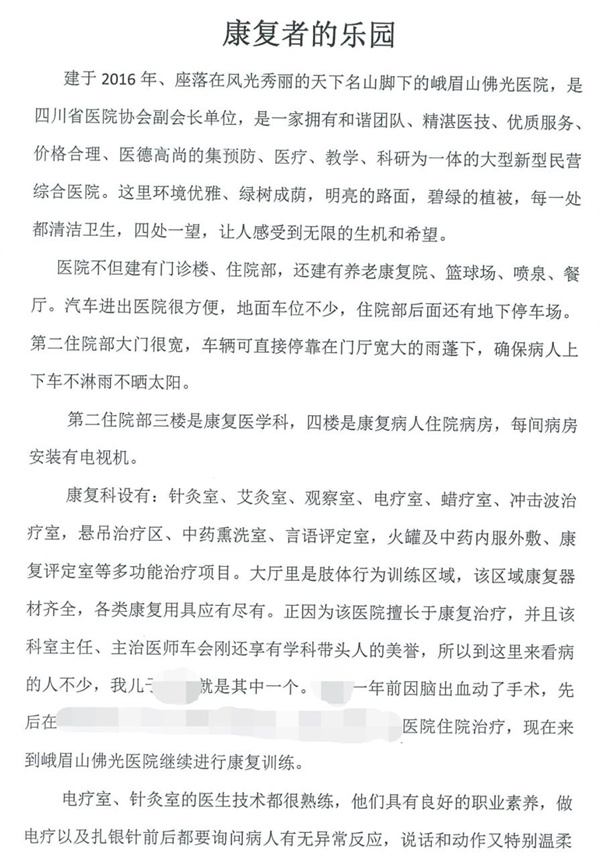 四川新闻网消息 康复者的乐园——这是日前,峨眉山佛光医院康复疼痛科收到的一封特殊信件,字里行间表达了对医院康复医疗的充分认可。