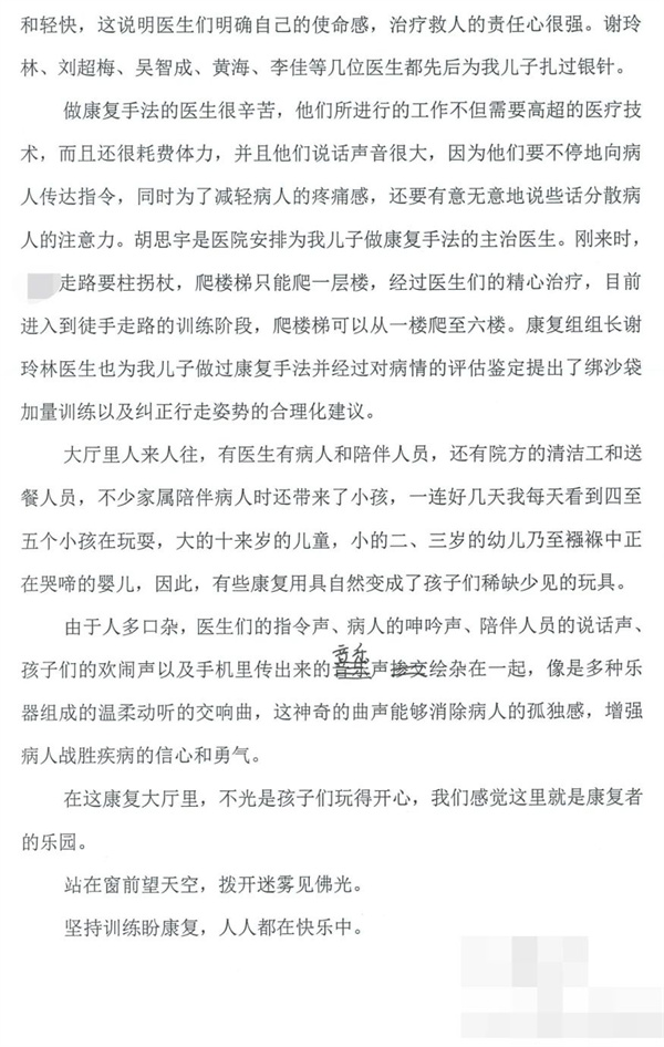 送来信件的是康复疼痛科的“老熟人”王叔叔。他的儿子一年前因脑出血手术后经家人商议最后选择来佛光医院康复治疗。