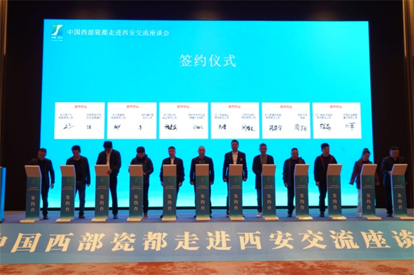 座谈会上,夹江县人民政府副县长李宪勤与咸阳陶瓷研究设计院副院长刘小云签订《关于推动西部瓷都转型升级发展的合作协议》。夹江县米兰诺、建辉、索菲亚、盛世东方、兴泰和等十一家陶瓷企业与西安经销商代表签订陶瓷产品购销协议,签约金额达13.2亿元。(供稿:夹江县委宣传部)