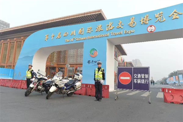 本届旅博会,持续时间长、参会嘉宾多、社会影响大,交通安保任务重、压力大。乐山市公安局高度重视交通安保工作,副市长、市公安局党委书记、局长邓华专题组织研究部署、现场督导交通安保工作。市公安局党委副书记、常务副局长干航,党委委员、政治部主任吕建军一线督导,市公安局交警支队领导现场指挥交通安保工作。