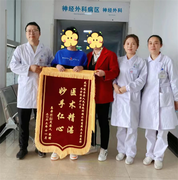 一面锦旗是用医生精湛的医术和护士精心的护理以及患者与家属的信任凝聚而成的,这不仅是对神经外科医护人员的肯定,更是神经外科医护人员前进的动力。(供稿:犍为县人民医院 祝丹)