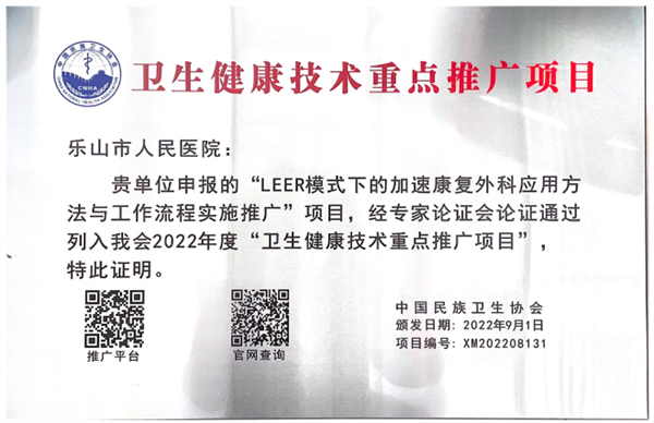 据了解,LEER模式下的加速康复外科项目所取得的成效已形成知识产权和科研立项 57项,是中国民族卫生协会的健康卫生重点推广项目,入选国家卫健委健康卫生推广项目。2021年获得乐山市科技进步一等奖, 2022年获得乐山市科技进步杰出贡献奖和四川省卫生科技(应用类)三等奖。