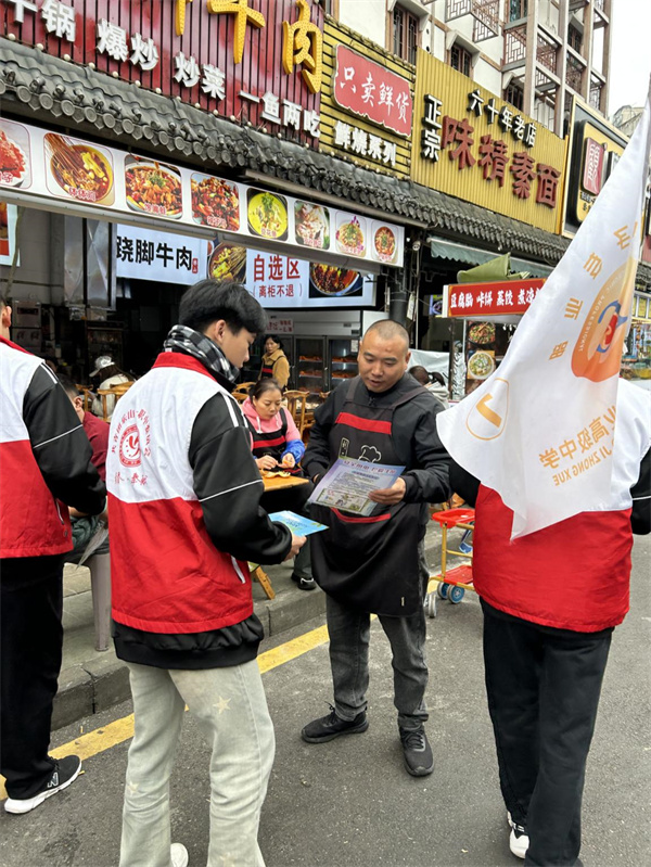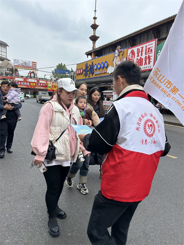 近日,乐山一职中电子专业部各班学生团干部和入团积极分子在青年团干教师李雅浠的带领下,来到了张公桥美食街附近,向商家和社区居民做家庭安全用电常识宣讲。