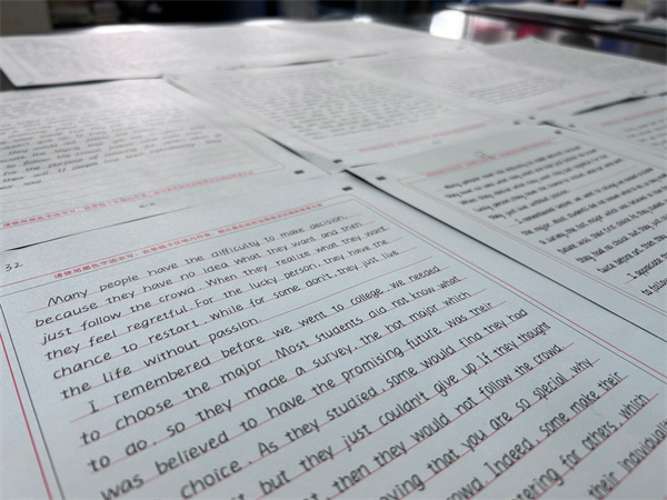 初赛过后,69名选手脱颖而出,进入要求更高、更具挑战性的决赛。在比赛过程中,学生们信心满满、坐姿端正、屏气凝神、挥洒笔墨、精益求精,充分展示各自的实力。其字母圆润饱满,单词高度、大小、间距都精雕细琢。其字迹或遒劲厚重,或秀美挺拔,或疏朗清隽,一笔一划都凝聚了努力和汗水。一张张参赛作品,笔画流畅,结构匀称,字体多样,形式新颖,颇具美感。