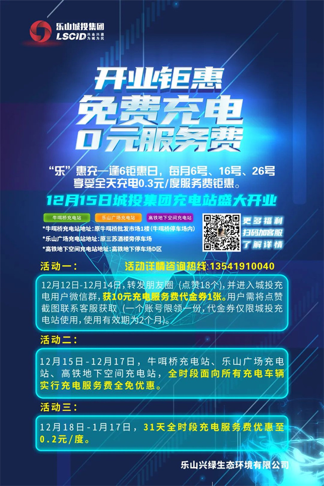 四川新闻网消息 为缓解乐山市新能源汽车充电难问题,为市民绿色出行提供便利。由乐山城投集团乐山兴绿生态环境有限公司(以下简称:兴绿公司)投资建设的首批新能源汽车充电站即将于12月15日正式投入使用。