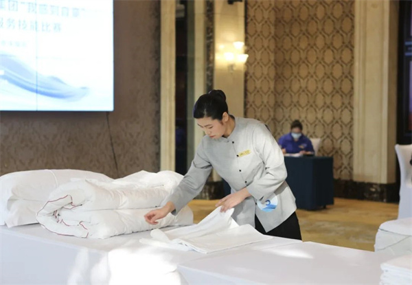 本次竞赛设前厅接待服务、客房服务、中餐宴会创意摆台三个项目,来自成都及周边区域酒店的七支代表队汇聚一堂,同台竞技。中式铺床服务技能比赛,主要考核参赛选手在规定时间内完成铺床单、枕头定位等操作。马燕林动作有条不紊,一气呵成,展示了娴熟的业务能力,将力量与技巧融合之美表现得淋漓尽致。