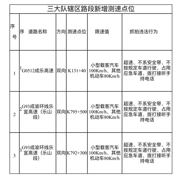 四川新闻网消息(记者 李举涛)记者1月3日从四川省公安厅交通警察总队高速公路四支队三大队获悉,该大队拟对G0512成乐高速K128+200m至K131+200m及G93成渝环线K795+500m至K788+500m共计10公里路段执行限速,限速值由“小型载客汽车120Km/h,其他机动车100Km/h”调整为“小型载客汽车100Km/h,其他机动车80Km/h”。同时新增设移动测速点位,并于1月8日正式启用。