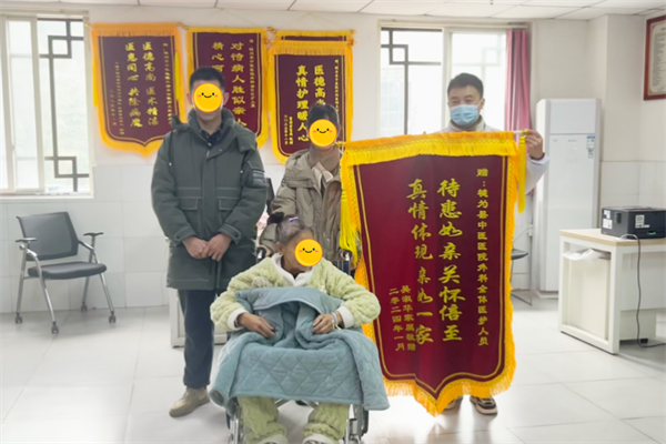 出院当天吴某华在家人的陪同下,满怀感激地将一面写着“待患如亲,关怀备至,真情体现,亲如一家”的锦旗送到犍为县中医医院外科医护人员手中。她握着医生的手激动地说:“感谢外科全体医护人员对我的细致照顾,如果不是你们精湛医术及亲切关怀,我的病情不会康复得这么快,我们全家人都感谢您们了!