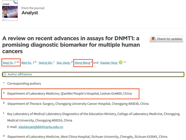 四川新闻网消息 近日,国际期刊《Analyst》(IF=4.2,Q1区)刊登了名为“A review on recent advances in assays for DNMT1: a promising diagnostic biomarker for multiple human cancers.”的学术论文。犍为县人民医院检验科为该论文第一署名单位,检验科硕士研究生余阳为第一作者,重庆医科大学教授杨晓兰为该论文通讯作者。该论文是由犍为县人民医院(第一署名单位)与重庆医科大学、重庆大学肿瘤医院以及四川大学华西医院联合发表。据悉,Analyst是RSC(英国皇家化学学会)出版的化学类权威国际期刊,即时影响因子4.2,是JCR工程技术大类一区期刊。