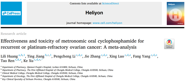 犍为县人民医院药剂科临床药师黄莉丽深入分析目前节拍化疗在复发性或铂难治性卵巢癌患者中治疗价值,相关研究成果以“Effectiveness and toxicity of metronomic oral cyclophosphamide for recurrent or platinum-refractory ovarian cancer: A meta-analysis”为题在《Heliyon》(JCR 2区,IF:3.776)在线发表,犍为县人民医院药剂科为该论文第一署名单位,药剂科临床药师黄莉丽为第一作者,成都医学院第一附属医院徐可博士为该论文通讯作者。该论文是由犍为县人民医院(第一署名单位)与成都医学院第一附属医院联合发表。据悉,Heliyon是细胞出版社(Cell Press)旗下的一本全科学、开放获取的期刊,由爱思唯尔(Elsevier)公司出版发行,即时影响因子3.776。