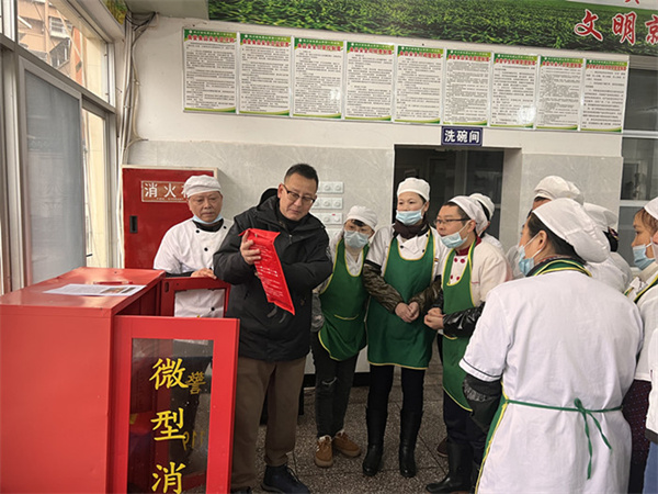 李校长详细检查了食堂的消防箱、消防水袋、消防锤、灭火器等并召集食堂工作人员指导练习了灭火器等的具体使用规范和使用要领以及在火灾场所的逃生办法。同时对宿舍管理人员进行了现场培训,并讲解消防设备应用及消防知识。