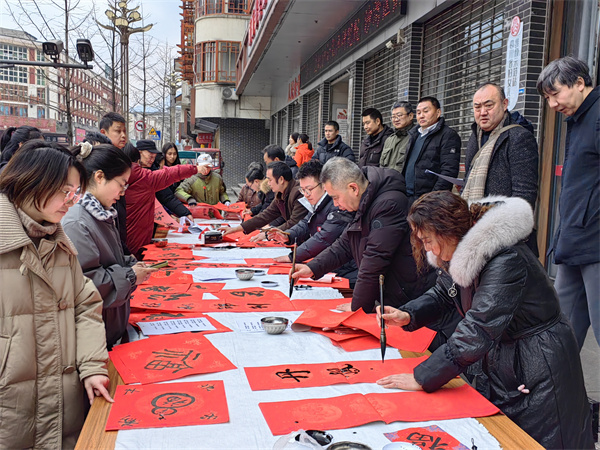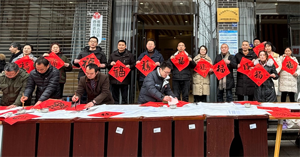 四川新闻网消息 春联万家,福暖四季。1月26日下午,乐山市沙湾区政协会同铜河街道党工委、办事处,组织区政协诗书画研究院和沫若书画院的书法老师,深入铜河街道开展以“春联万家˙福满家园”为主题的新春写春联送万福活动,义务书写并向居民赠送春联和福字,共同迎接充满希望的龙年。
