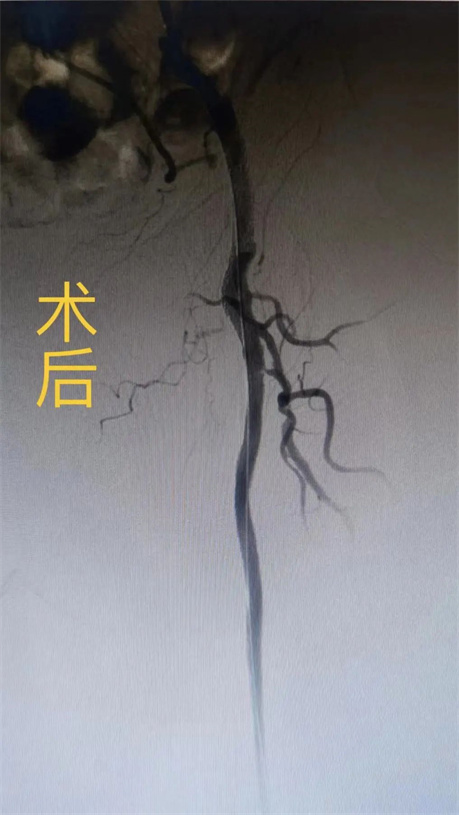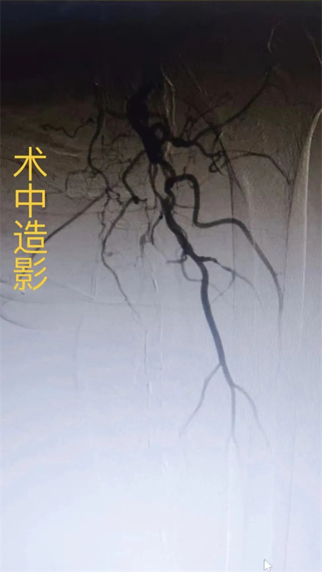 面对如此复杂的病变情况,医疗团队沉着冷静,将支架成功覆盖至左下肢膝上血管狭窄处,术后造影显示狭窄部位扩张效果良好。
