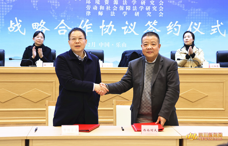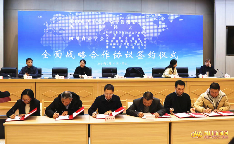 四川新闻网消息(李薪 摄影报道)2月2日,为落实中央、省、市全面普法依法治理、合规管理各项决策部署,推动知名高校、科研院所与乐山国资委、市属国有企业全面战略合作走稳走实走深,携手谱写校地、校企合作发展新篇章,乐山市国资委和西南财经大学、四川省法学会所属六大研究会全面战略合作协议签约仪式今日在乐山举行。