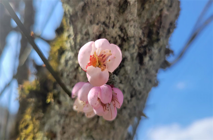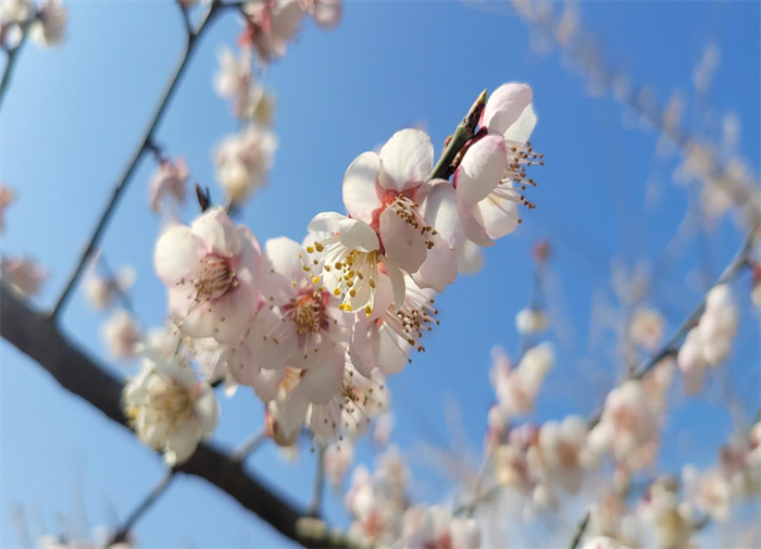 一朵朵白嫩嫩娇滴滴的梅花绽放枝头,仿佛在给这沉闷的冬日做最后的道别,又不失傲骨的摆弄花姿,可谓:“花吐胭脂,香欺兰蕙,各各称赏。”它们不畏严寒,向来往的游客展示着独有的坚韧与美丽,也在无声地传递着春来的消息。