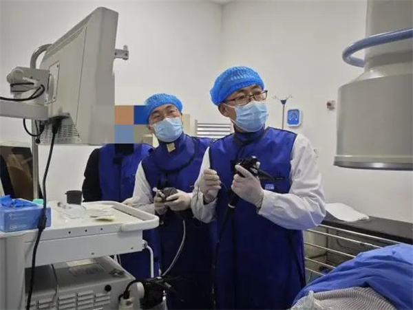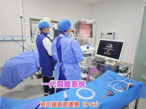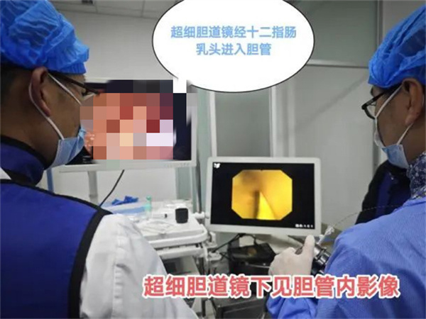 为进一步查明狭窄病因,在完善必要检查、征得患者同意后,拟取活检以明确诊断。科室主任胡红强亲自操作,主治医师郭涛以及主治医师李聪从旁辅助,为患者实施经口超细胆道镜检查术。