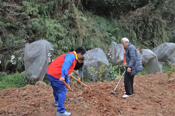 当天,青年志愿者们在果农的指导下手持嫁接刀,轻轻划开树皮,将两段树枝结合在一起,仔细用薄膜包裹着枝干。一锹土、一桶水,大家按照分组默契配合,或扶正果苗、或填坑夯苗,现场繁忙有序,将小小果苗播种到春天的希望里。