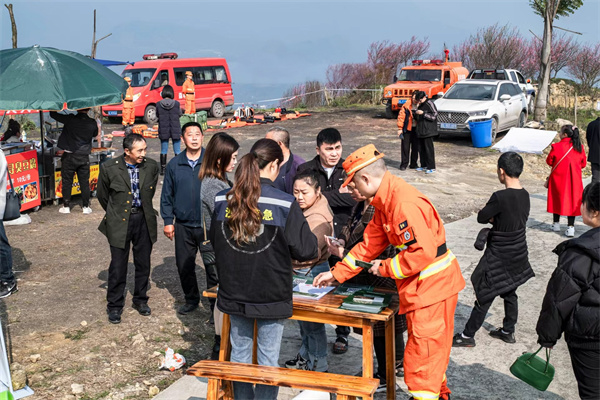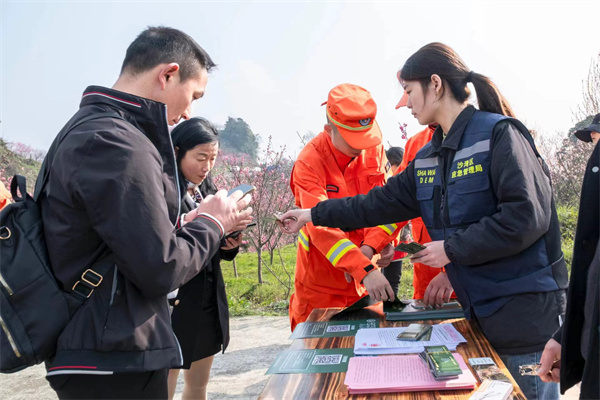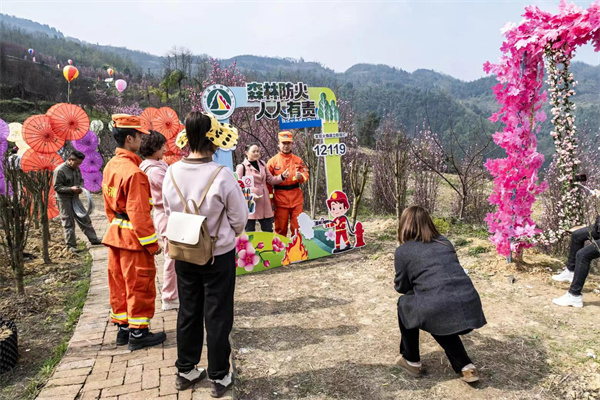 乐山市沙湾区轸溪镇轸溪村是沙湾区的重点防火村,辖13个村小组,452户1192人,林区覆盖面积10310亩。每年3、4月正是轸溪村“蛮谷桃园”桃花盛开绽放的日子,来往游客日流量达1000余人次。为更好地落实业主的森林防灭火主体责任,切实有效地扩大森林防灭火宣传范围和传播力,3月18日,沙湾区森防办在“蛮谷桃园”组织开展森林防灭火宣传教育活动。