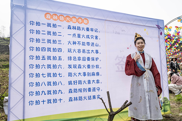 活动中,沙湾区森防办采取森林防灭火知识线上有奖答题,打卡抽奖送门票、送消费券,宣传签名墙,发放宣传单等多样形式为来往游客、群众宣传普及森林防灭火相关知识。来往游客和当地村民兴致盎然,纷纷参与线上有奖答题、拍照和签名打卡活动。在签名打卡环节,一位身着汉服的游客自告奋勇地当起了宣传大使,她用清脆洪亮的声音录下了森林防火拍手歌,她说“我要在朋友圈向我家人、亲戚、朋友们宣传森林防灭火知识,提高他们的森林防灭火意识,为保护我们的绿色家园出一份薄力,我呼吁森林防火,从我做起。”此次活动,沿途布置森林防火宣传标语6个,宣传横幅3幅,发放宣传单1000余份,游客扫码答题500余次、签名300余个,起到了森林防火宣传教育的良好效果。