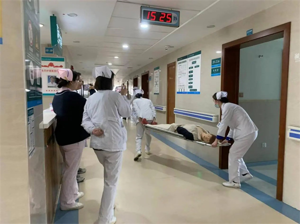 此次培训的重头戏——高楼层灭火应急疏散演练在泌尿外科展开。模拟场景中,一护士发现病区内突发火情,立即启动应急预案,联合值班人员快速进行呼救、疏散、初期火灾扑救等系列应对措施。演练过程中,全体参演人员反应迅速,职责明确,操作熟练,急救意识强烈,得到了越浩指导员的高度评价,并针对演练情况提出了宝贵的改进建议。