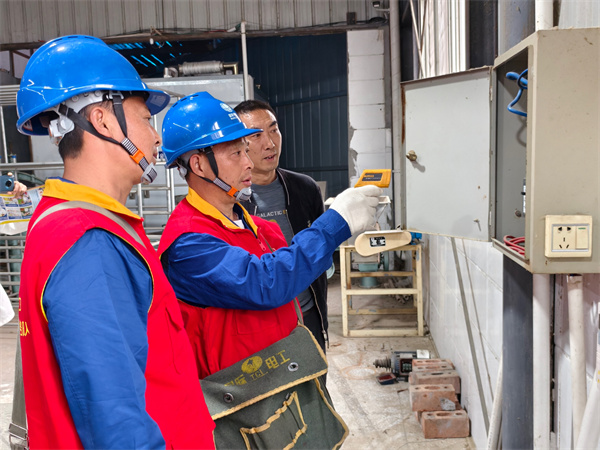 3月26日,周晓林和谢晓忠对厂区内用电设备设施、线路进行了仔细检查,详细了解用户用电需求,耐心讲解安全用电知识,保障春茶生产和制作。