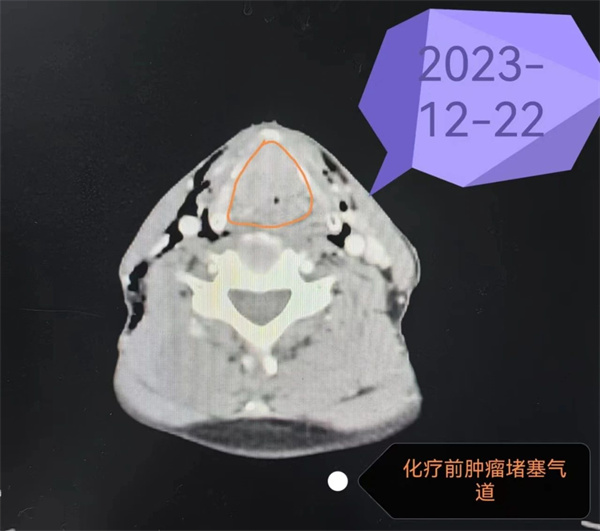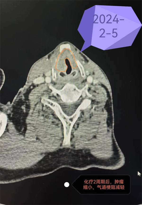 终于,在2024年2月5日的复查中,增强CT检查结果显示肿瘤已经明显缩小,不再影响呼吸。当患者听到他可以拔除气管插管这个消息时,激动得热泪盈眶。是的,这是生命的奇迹,患者也重新找回了自己的声音。