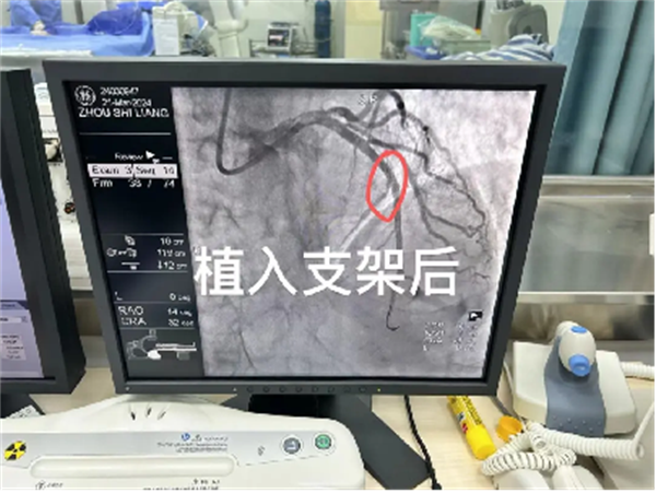 医生立即建立静脉通路并给予阿司匹林肠溶片300mg、氯吡格雷片300mg嚼服,阿托伐他汀钙40mg口服,并紧急联系导管室,启动绿色通道行急诊冠状动脉介入治疗,成功完成冠状动脉造影显示前降支闭塞,给予球囊扩张并植入1枚支架,开通血管血流恢复,整台手术用时仅30分钟,术中,患者突然出现心脏骤停,经介入手术团队的紧急救治,患者已转危为安,术后恢复良好,目前已康复出院。