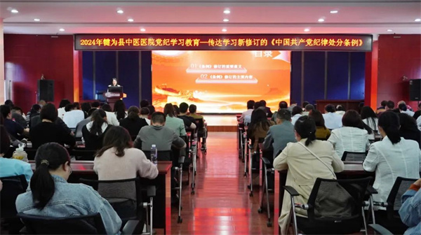 四川新闻网消息 为全面落实党中央、省市县委决策部署,持续在学纪、知纪、明纪、守纪上下功夫,进一步增强政治定力、纪律定力、道德定力、抵腐定力。4月23日下午,犍为县中医医院在内科大楼六楼学术厅召开党纪学习教育大会,会议由党委副书记、院长张孝祥主持,全体党员干部职工共计300余人参会。