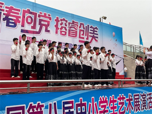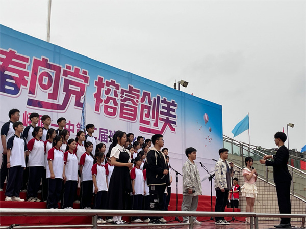活动中,同学们身穿整洁、统一的服装,带着朝气,带着梦想,以歌颂中国共产党、歌唱祖国为主旋律,唱得慷慨激昂、神采飞扬。