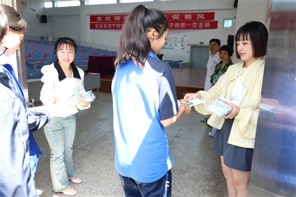 宣讲活动开始前,为入场的老师及同学们发放人手一份的“加奶、增豆、减油”科普宣传资料。