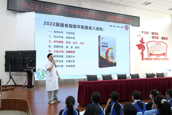 营养科营养师杨冯贵以《奶豆添营养,少油更健康》为宣讲题目,为现场老师及同学们讲解“加奶、增豆、减油”相关营养知识,联系同学们的日常生活实际,教会同学们如何正确挑选奶类及其制品、如何增加大豆及其制品的摄入、如何选择低脂健康的零食等实用型技能。