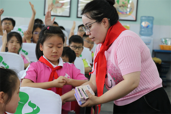 柏杨小学刘校长和老师学生们对科普宣传团队的到来表示热烈欢迎和感谢,并由学生为老师们佩戴红领巾表示感谢。