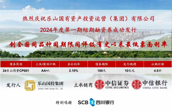 四川新闻网消息 2024年6月13日,乐山国投集团成功发行2024年度第一期短期融资券(CP),发行规模10亿元,票面年利率2.1%,期限180天,本期短期融资券发行创全国同品种、同期限、同评级最低票面利率。