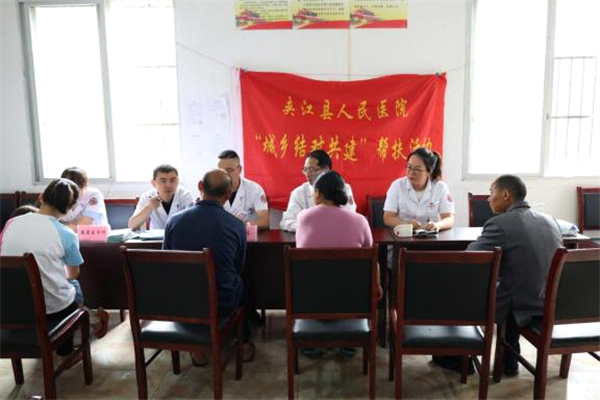 医院党委组织各党支部部分党员到吴场镇光荣村开展“城乡结对共建”义诊活动。现场为群众提供健康咨询、测量血压等服务,耐心细致分析病情,针对不同的症状,给予专业的健康指导。