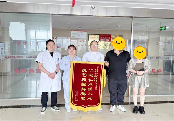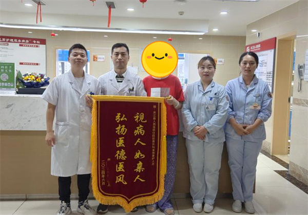 患者肖女士因车祸后腹部及左侧胸部疼痛不适在夹江县人民医院住院治疗,主管医生卢佳文医生与曹国峰医生在充分评估病情后,制定出翔实的诊疗方案,为肖女士实施腹腔镜下小肠破裂修补术。在术后经过科室医护人员的积极治疗和精心护理,肖女士病情得到有效控制并逐渐好转。患者及家属为表谢意,特意定制了一面“仁心仁术暖人心,德艺双馨扬美名”的锦旗送到了医护人员手中。