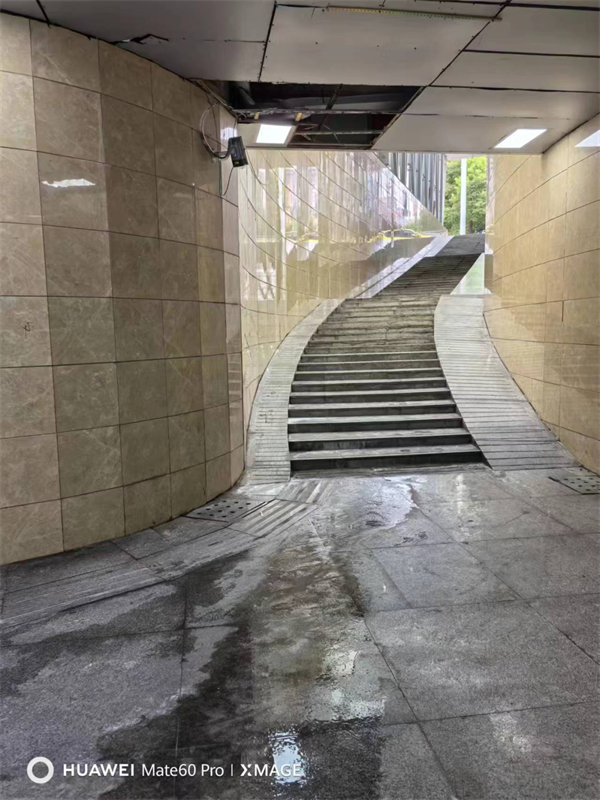 通过前期仔细排查,目前存在的渗水情况系顶棚和止水带老化所致,加之下穿通道地势低,路面积水随入口台阶流入,引起通道内地面积水现象。本次维修将在顶棚覆盖耐高温防水材料,在通道楼梯下端修建截水沟对流入的雨水进行截流,汇集至排水系统,并对已损坏的照明、消防设施同步进行维修。整治完成后,将有效解决通道内渗水、积水问题,消除安全隐患。