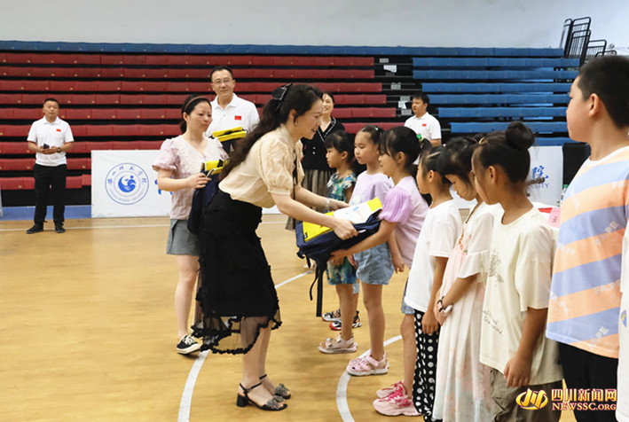 开班仪式现场,乐山市人民医院党委书记陈佳向乐山师范学院体育学院副院长张爱平授予了托管营营旗,并亲自向学生代表赠送了学习用品,寄语孩子们在托管营中能够开心快乐、学有所获。