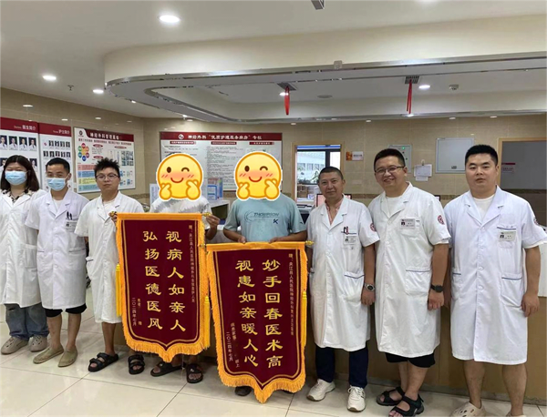 原来,一个多月前在无明显诱因的情况下,这位患者出现四肢麻木、乏力,行走不稳等情况,且逐渐加重。为寻求治疗来到夹江县人民医院,经颈椎核磁共振检查发现,其颈髓髓内占位性病变伴出血。神经外科贾兴医师作为主治医师组织全科讨论,共同为患者制定治疗方案,讨论过程中周骏主任医师、潘绍云副主任医师等科内多位医师的分别阐述治疗重点及注意事项。经患方选择,授权同意后,医院立即为患者做了“脊髓髓内病损切除术”,术后伤口愈合良好,现患者四肢感觉、力量逐渐恢复。所以,患者家属为表感激之情特意送来锦旗。