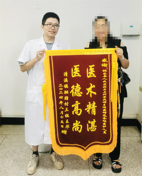 8月15日上午,办理完出院手续的患者王某旋即将一面印有“医术精湛,医德高尚”的锦旗送到了犍为县人民医院内五科,表达对宋茂明主治医师及内五科全体医护人员的感激之情。