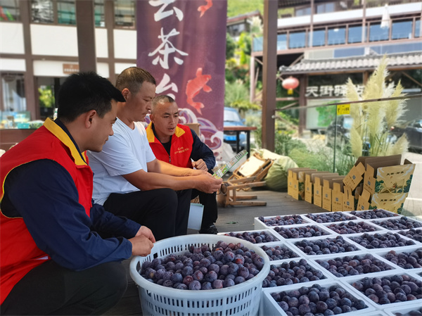 9月4日,乐山峨眉山市绥山镇赵河村李子坪脆红李果园地里,种植户凌本春一家正在采摘脆红李,分拣装箱。国网乐山供电公司双福供电所电力网格员梅小红、陈超来到这里,对果园的电力设施进行用电隐患排查。
