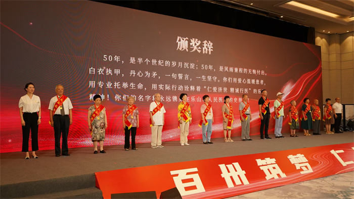 活动现场为在乐山市人民医院工作50年的职工颁发了“光荣在岗50年职工”纪念章,感谢他们半个世纪的无私奉献。乐山市人民医院退休专家代表谢邦富和青年医务人员代表李佳萌分别发言,表达了对医院的深厚情感和对未来的美好期待。
