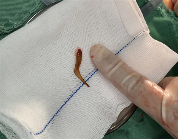 与患者及家属充分沟通后,外科医护团队立即联合手术室急诊在全身麻醉下行腹部探查术,术中可见腹腔内产生了大量脓性液,乙状结肠与直肠交界处上方见网膜与肠管之间形成一脓肿,清除脓肿后发现一根长约4.0cm的鱼刺刺破大肠,导致大肠穿孔而引起的继发性腹膜炎,由于肠穿孔时间较久,经过层层剥茧, 终于,一根扎穿大肠的鱼刺被顺利取出。