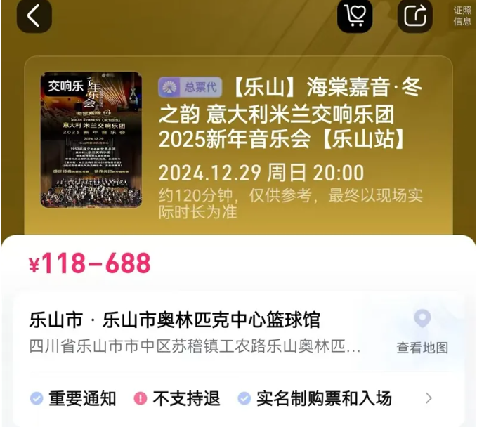 根据大麦网APP上显示的该新年音乐会购票页面,门票预售共分为六档,价格分别为118元、218元、388元、488元、588元和688元。购票采用实名制,观众在购票成功后无需取票,进场时只需出示相应的证件即可入场。(来源:乐山市融媒体中心)