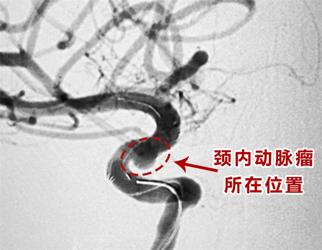 术中造影清晰可见右侧颈动脉C6段动脉瘤呈宽基地状,形态不规整。医疗团队在病变段处释放颅内支架,覆盖动脉瘤口后,使用2根弹簧圈栓塞瘤体,再次造影显示瘤体填色满意,颅内血管及支架通畅,治疗成功。